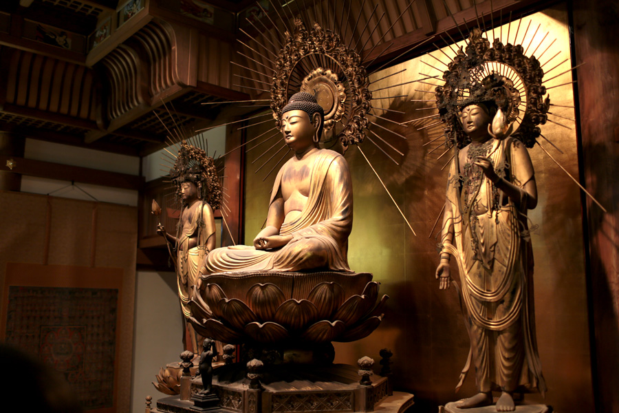 阿弥陀さまの左におられる観音様は慈悲の菩薩さま。